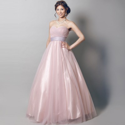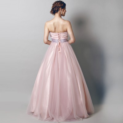 薄いグレーカラーチュールとピンクカラーチュールを2色重ねた、大人の雰囲気漂うピンクカラードレス。シンプルデザインと甘過ぎないピンクは、どの年代の方にも選びやすいと好評です。