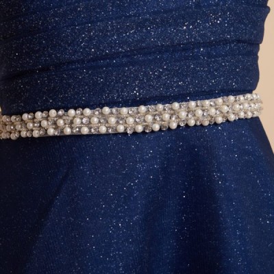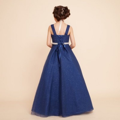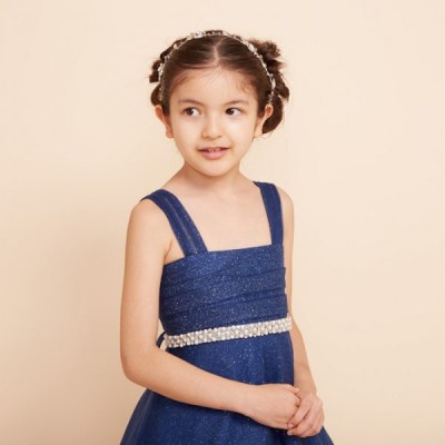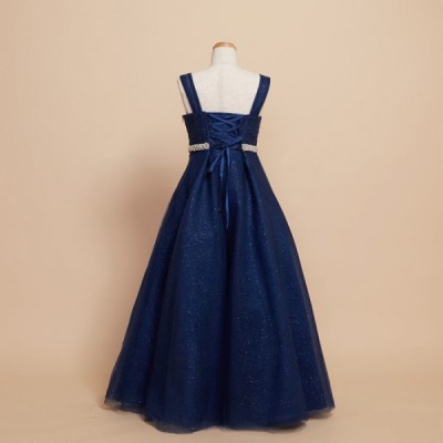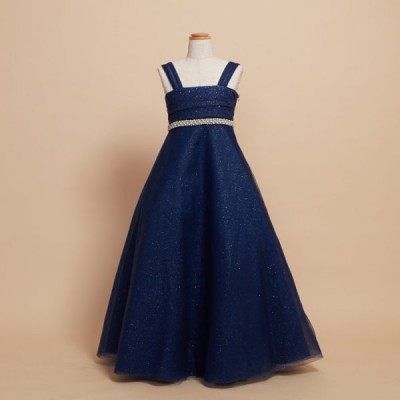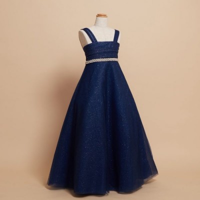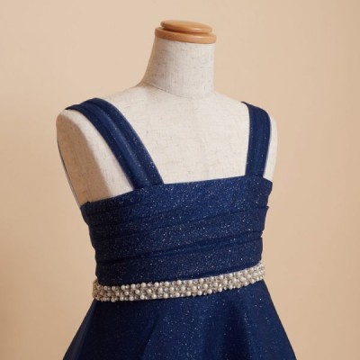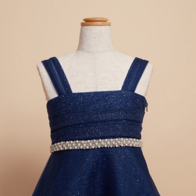星空のようにキラキラ光るふんわりグリッターチュールのネイビーカラードレスです。ウエストにはパールとストーンを合わせた宝石のような装飾ベルトデザインを。キラキラゴージャスなドレスで注目度アップ!パニエを合わせてさらにふんわり着ていただくのがおすすめです。発表会や記念写真撮影用にぜひ。