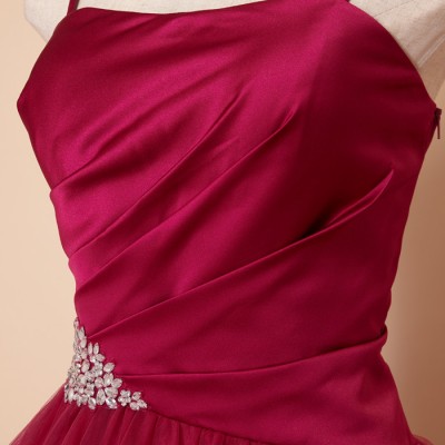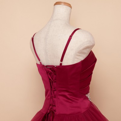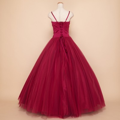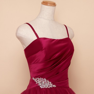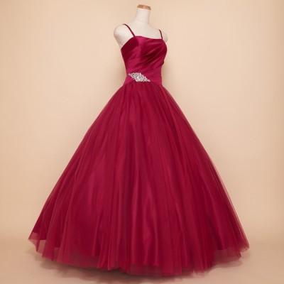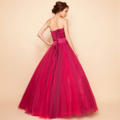 光沢のある厚手のサテンを上半身に使用し、腰部分にはアクセントとしてキラキラのビーズ装飾、パニエ無しでもふんわりとボリュームたっぷりに広がるスカートはシンプルなデザインながらも見映えのするステージドレスです。ウエスト部分を少し斜めにすることで全体が引き締まってみえるようデザインにもこだわりました。演奏会や発表会などはもちろん、結婚式の二次会ドレスとしても大人気!ビビッドな色合いの鮮やかなピンクカラーはここぞという舞台にぴったりです。