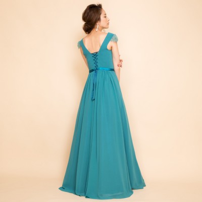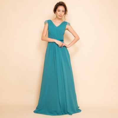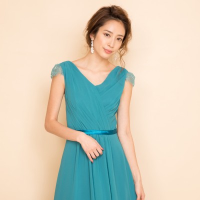 【OUTLET】エメラルドVネック肩レース付きシフォンドレス