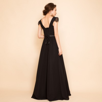 ブラックカラーVネック肩レース付きシフォンドレス