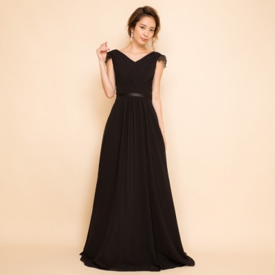 ドレス生地に柔らかいシフォンを使用する事で、品のある控えめな印象に。胸元や肩の開きが気になる方へおすすめのドレスです。露出を抑えたデザインのブラックカラードレスは、フォーマルな場におすすめしたい1着です。