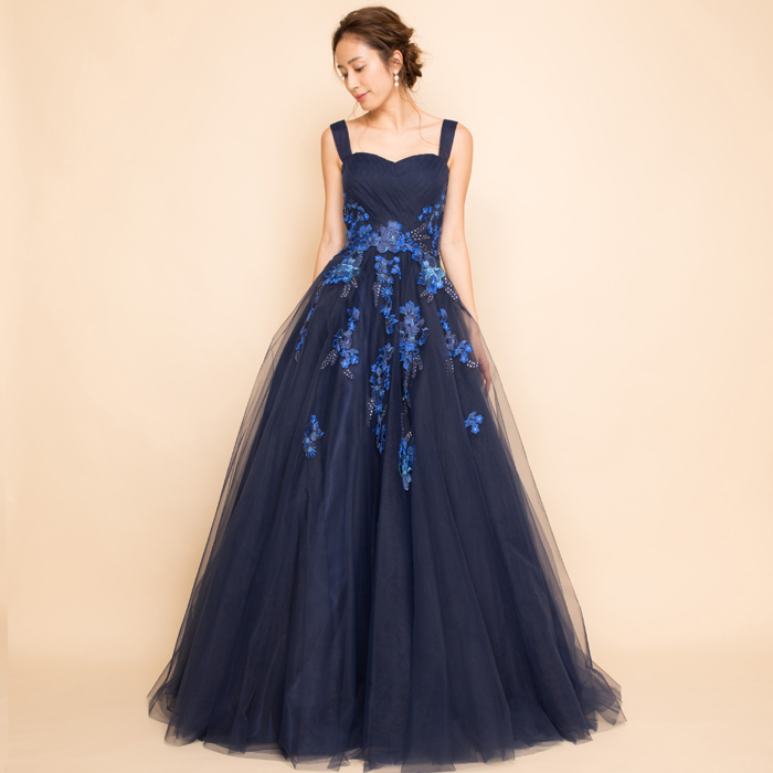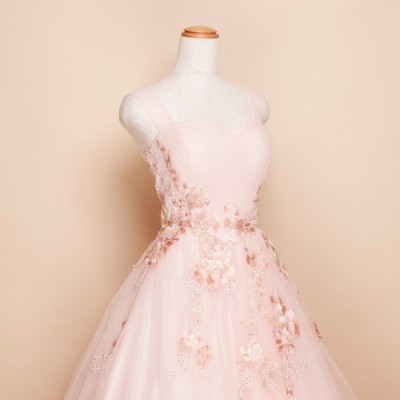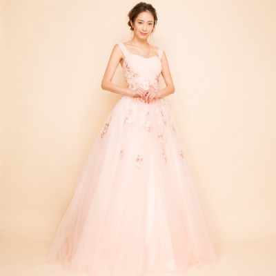 ボリュームたっぷりなチュールスカートにたくさんのフラワー刺繍とラインストーンをあしらった、豪華なプリンセスラインのステージドレス。肩紐が幅広なのでとても安定感があります。桜色の淡いピンクカラーで可憐な女性へ。甘い雰囲気ですが刺繍にペールカラーを使用する事で大人っぽい上品さも感じられます。花嫁様のカラードレスや2次会ドレスにもおすすめです。