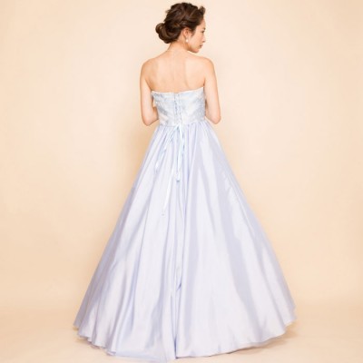 ホワイト&スカイブルーのジャガード生地に明るいスカイブルーのタフタスカートを合わせた、シンデレラのような淡いブルーカラードレス。