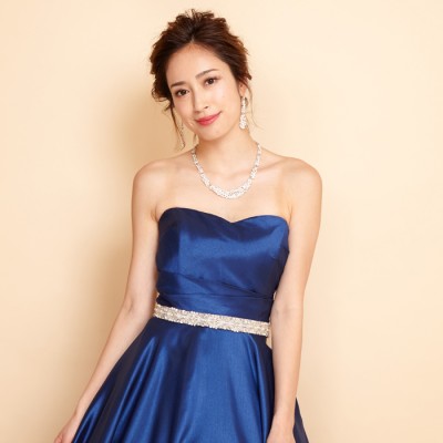 シャンタン生地特有の独特な風合いと光沢が魅力の、重厚感のあるゴージャスドレス。ウエストのビーズベルトが豪華さをより際立たせます。