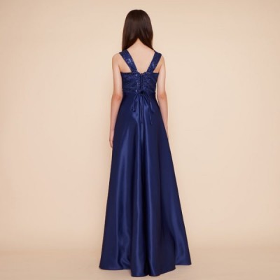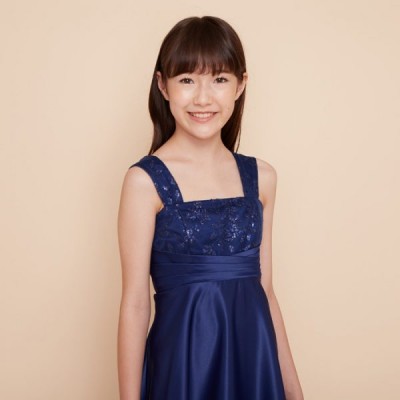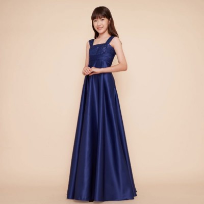 高級感あるマットなサテン生地を使用した、スレンダーラインドレス。お姉さんぽく上品な着こなしが出来ます。より品よく、落ち着いた雰囲気には定番ネイビーカラーを。コンクールやオーディションなどに。