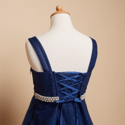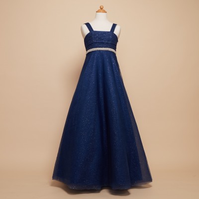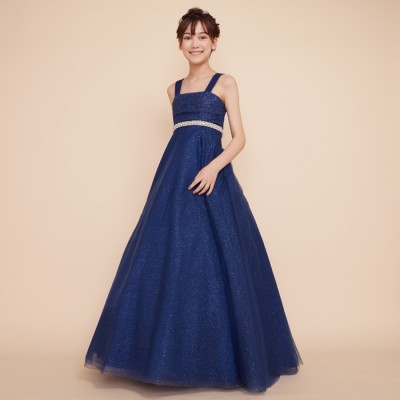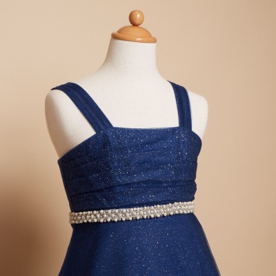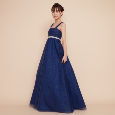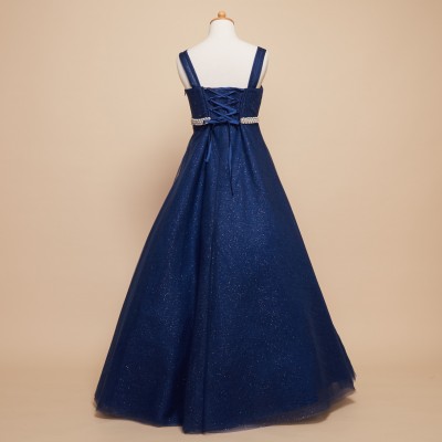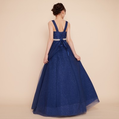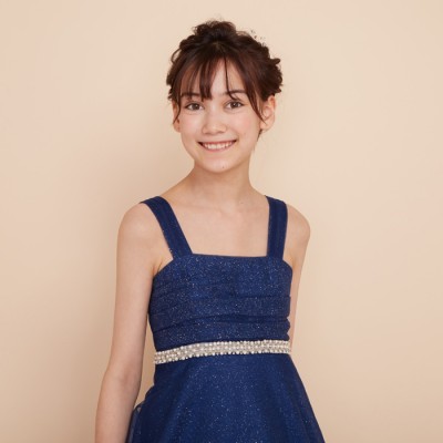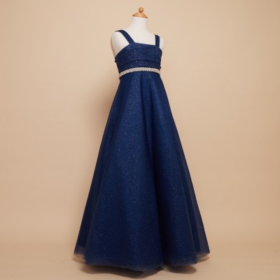 粉雪のようにキラキラ光るふんわりグリッターチュールのネイビーカラードレスです。ウエストにはパールとストーンを合わせた宝石のような装飾ベルトデザインを。キラキラゴージャスなドレスで注目度アップ!パニエを合わせてさらにふんわり着ていただくのがおすすめです。発表会や記念写真撮影用にぜひ。