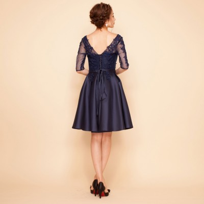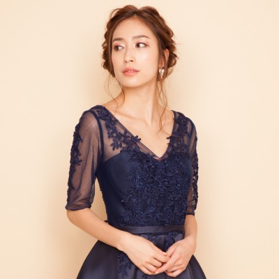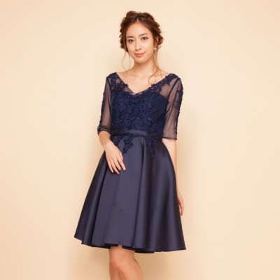 【OUTLET】レース袖ネイビーミディアム丈ドレス