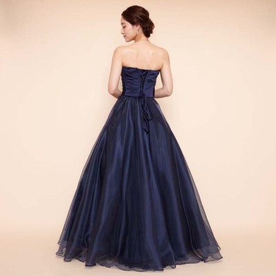 中に着用するパニエの種類次第でスカート部分のボリュームも調整して頂くが可能です。ネイビーカラーのこちらのドレスはピアノ、バイオリンの楽器はもちろんサックスなどのクールな楽器とも相性抜群ですよ!