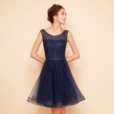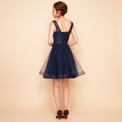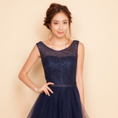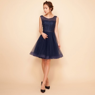 【OUTLET】立体チュールスカートネイビーカラーミディドレス