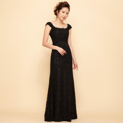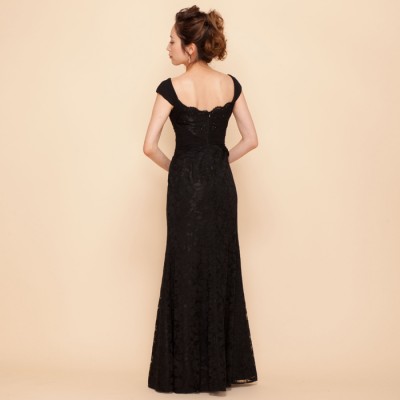 品のある総レース仕立てのマーメイドラインドレス。女性らしい美しいボディラインを際立たせるマーメイドドレスは、まさにパーティーの花のような存在。上見頃にはラインストーンが散りばめら、一層目を惹くデザインに。フォーマルなブラックは花嫁の母ドレスとしてもおすすめです。