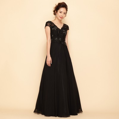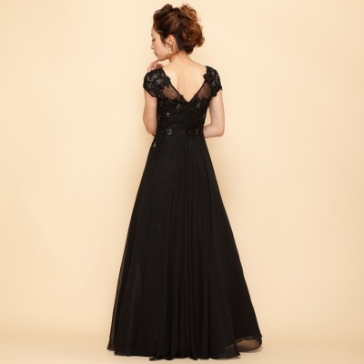 ブラック刺繍ビジューシフォンエレガントロングドレス