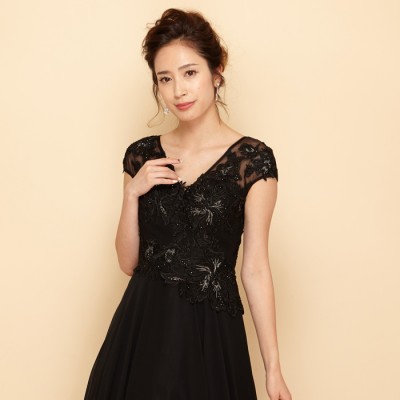 Ⅴ字に開いた胸元と背中が特徴的なショルダー付きドレス。上見頃にはフラワーモチーフ刺繍と一面にあしらわれたラインストーンが動くたびに輝き、とても豪華な印象を与えるパーティードレスです。ブラックはフォーマルな花嫁の母ドレスやクルーズパーティにおすすすめ。