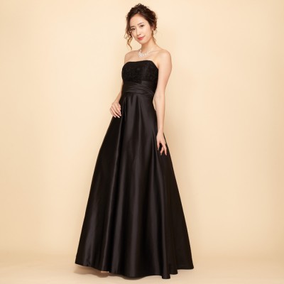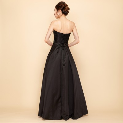 上見頃には落ち着いた輝きのラメ糸を混ぜたフラワーレース、全体には上質な厚手サテン生地を使用した気品あるドレスです。お手頃な価格帯とは思えない、高級感漂う1着。マットな光沢のブラックは、凛とした女性の美しさを表現します。