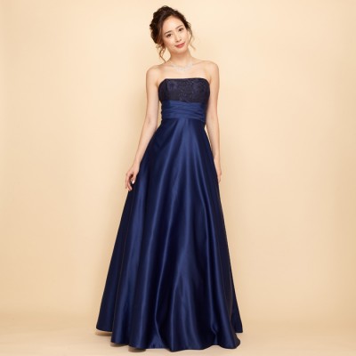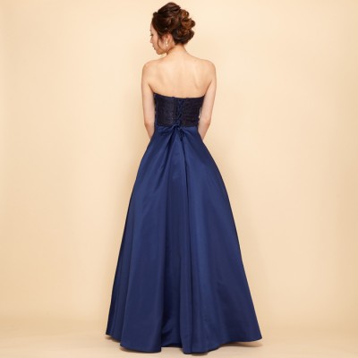 ネイビー上質サテンラメフラワーレースロングドレス
