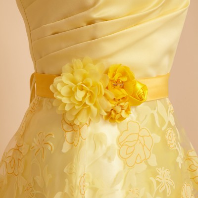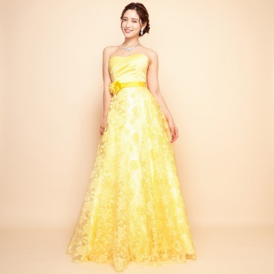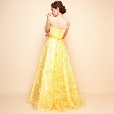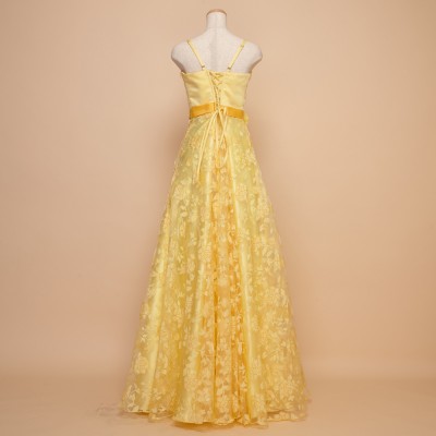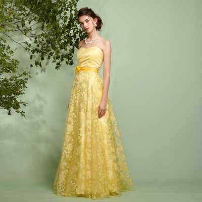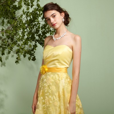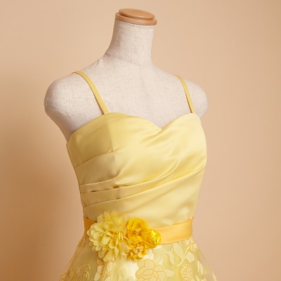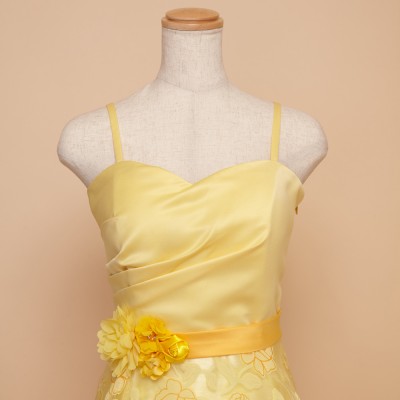 ウエストに付いた同系色のコサージュは、ドレスのイメージに合わせた特別仕様です。ふんわり柔らかい雰囲気のドレスをお探しの方におすすめしたい1着。華やかなイエローは観る人にステージに咲く花のような明るく元気な印象を与えてくれます。