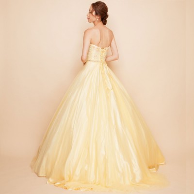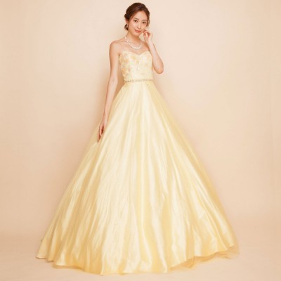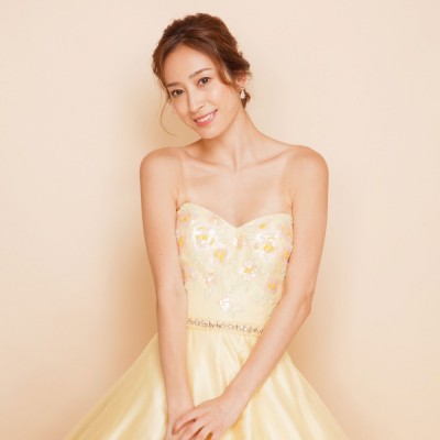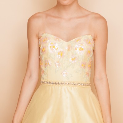 エスニック調スパンコールフラワー刺繍が個性的なライトイエローカラーのステージドレスです。ボリュームのあるスカートがとても華やかで、春夏のコンサートにおすすめです。