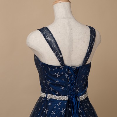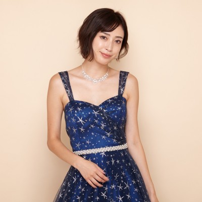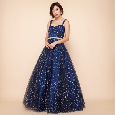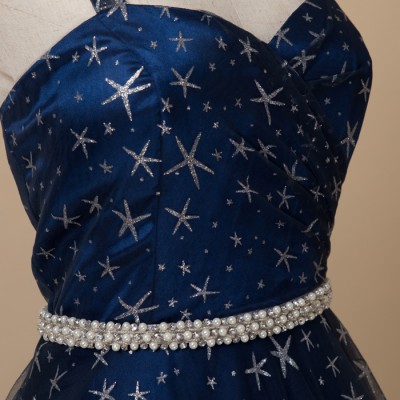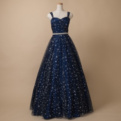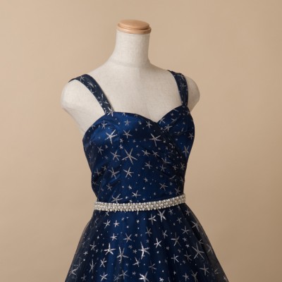 華やかなグリッタースターがドレス全体に散りばめられたボリュームAラインドレス。ウエストのパールとクリアストーンベルトでさらに豪華さをプラスしました。満点の星空や宇宙をイメージしたネイビーは、はやぶさ2のように未来を明るく照らす特別なドレス。現代曲の演奏や、イベント、結婚式の衣装としてもおすすめです。