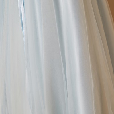 金糸を合わせたフラワーレースを使用しスカートにベージュとブルーのチュールを重ねることで甘さを抑え、どなたでも着やすいパステルカラーに仕上げました。サテン生地のウエストマークは全体の印象を引き締めるので、チュールドレスのふわっとした優しい雰囲気を残しつつすっきりとした見映えになります。