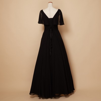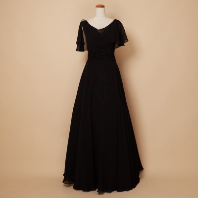 二の腕まで隠れるカバーリングデザインドレス。オーケストラや伴奏用、演奏家以外では花嫁の母用に最適なブラックドレスです。演奏時腕の可動域に支障がでないよう、カバーリング部分はフレアに。そして左肩部分にはスリットを入れる事で、動いたときのシフォン特有の軽やかさを存分に生かせるデザインへ。ワンポイントのストーンは控え目に輝き、洗練された印象を与えます。