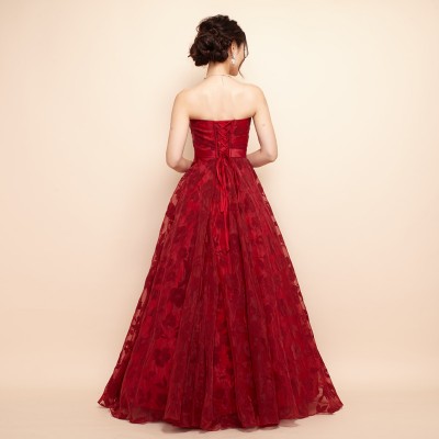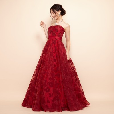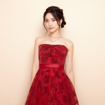 すっきりしたAラインシルエットで、どなたでも着こなしやすいデザインのステージドレスです。少し明るめのレッドオーガンジーに深みのあるワインレッドのフロッキープリントが遠目からでもしっかりフラワー柄が見えるので、華やかさのあるカラーです。