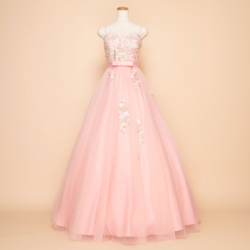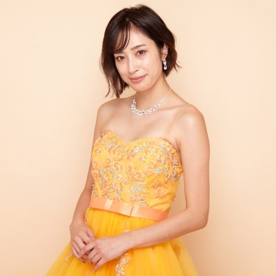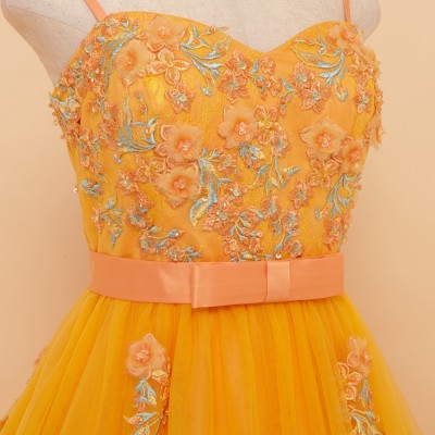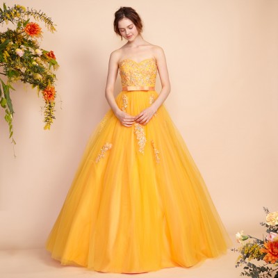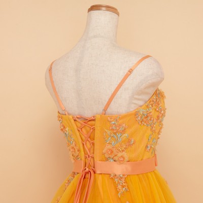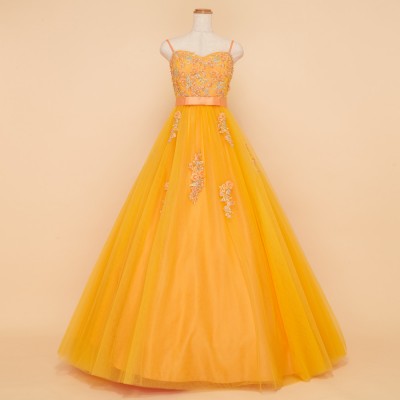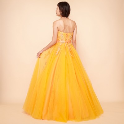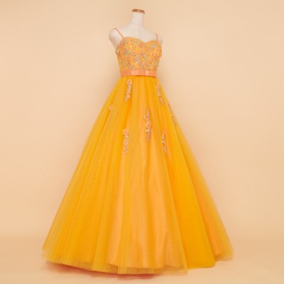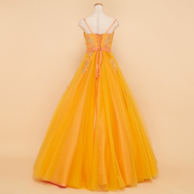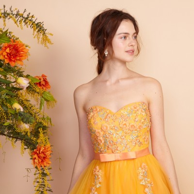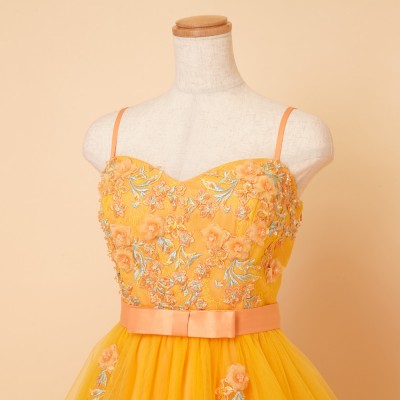 胸元に刺繍と立体フラワーモチーフをふんだんに散りばめ、スカートにも同様の装飾を施したプリンセスドレス。大きく広がるチュールスカートがとても可憐です。ウエストにはリボンモチーフをプラスしより一層可愛らしいお姫様のような雰囲気に。イエローオレンジは太陽光に映えるマリーゴールドのような鮮やかで可愛らしい印象のカラー。演奏会ドレスとしてはもちろん、花嫁様のお色直しドレスとしてもおすすめです。