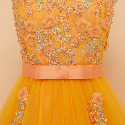 イエローオレンジ立体フラワー装飾ボリュームチュールドレス