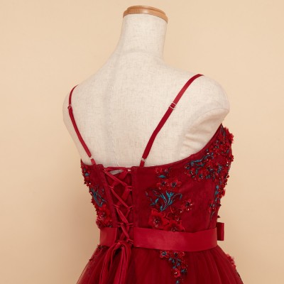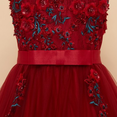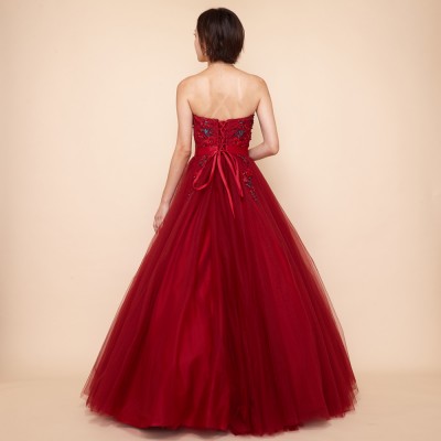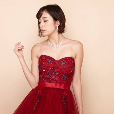 ローズレッド立体フラワー装飾ボリュームチュールドレス