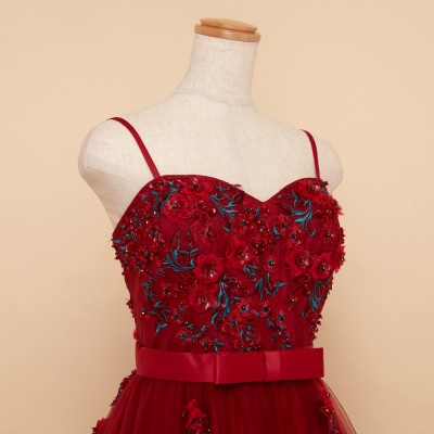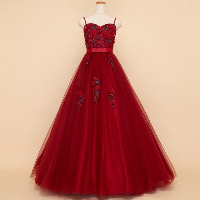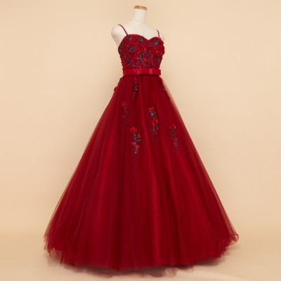 胸元に刺繍と立体フラワーモチーフをふんだんに散りばめ、スカートにも同様の装飾を施したプリンセスドレス。大きく広がるチュールスカートがとても可憐です。ウエストにはリボンモチーフをプラスしより一層可愛らしいお姫様のような雰囲気に。薔薇の花のような深紅のドレスにはグリーンの刺繍がアクセント。華やかな舞台の主役にふさわしい豪華で個性的なカラーのステージドレスです。