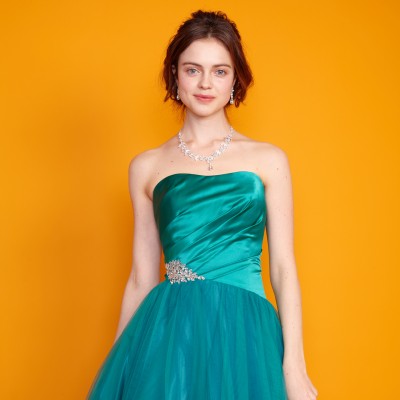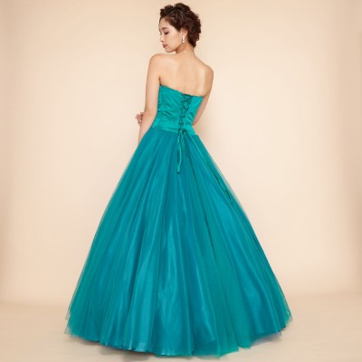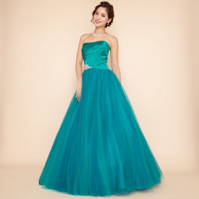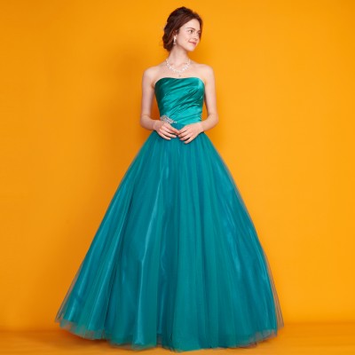 シルク調厚手サテンエメラルドチュールプリンセスラインドレス