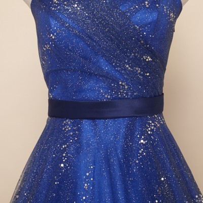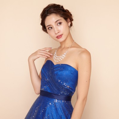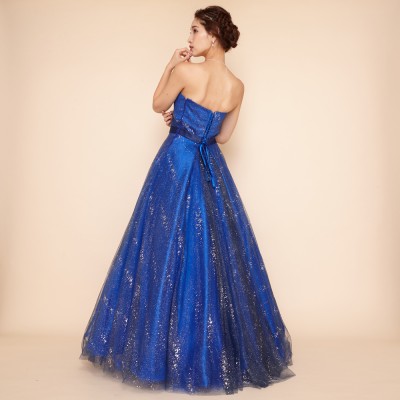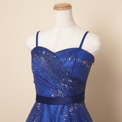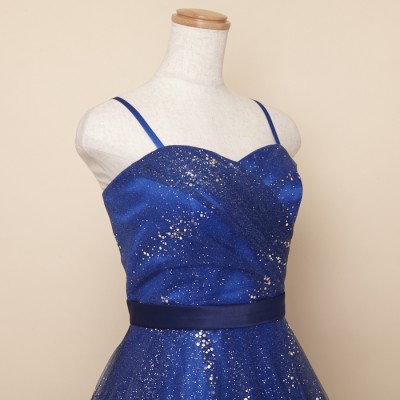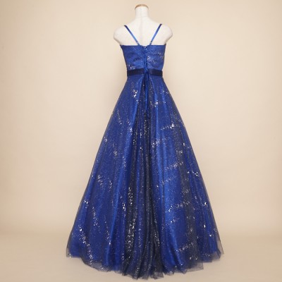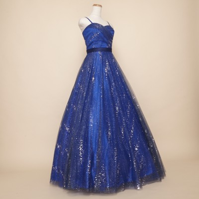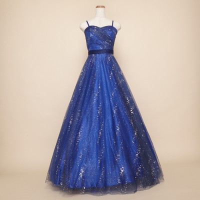 チュール全体にたくさん散りばめられたグリッターがキラキラとステージライトに反射する、とっても華やかなAラインロングドレス。まるで宝石箱から飛び出したような輝きです。夜空のを駆ける流星群のようなグリッターが煌めくロイヤルブルーカラーのドレスは主役のステージにふさわしい華やかさです。