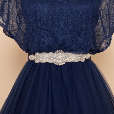 気になる腕周りをカバーしつつ、演奏にも支障が出ないようにゆとりを持たせた袖回りや、キュッと引き締まって見える豪華なビーズベルトなど、こだわりが詰まったデザインです。露出は控えたいけど華やかなイメージのステージドレスをお探しの方に♡ウエストの豪華なキラキラ装飾が引き立つシックなネイビーカラーです。