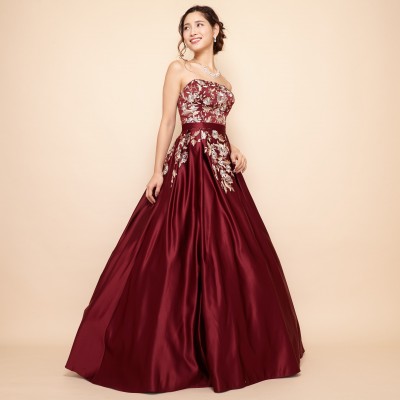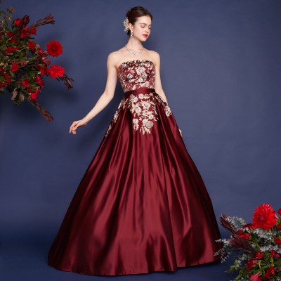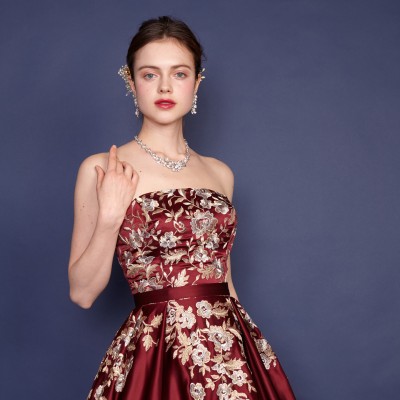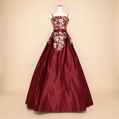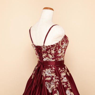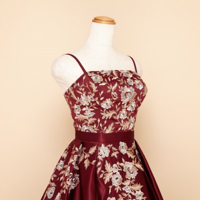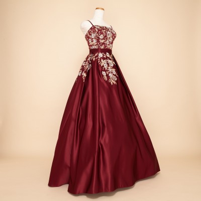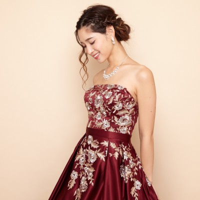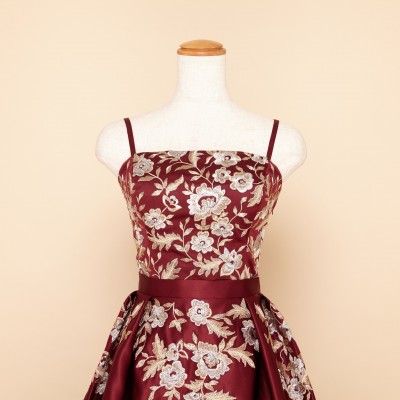 フラワー刺繍ワインカラーサテンボリュームドレス