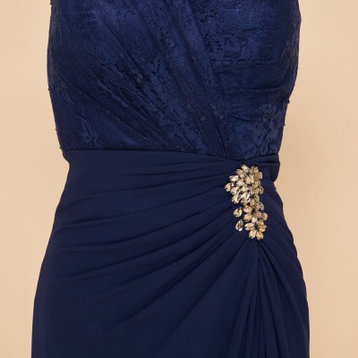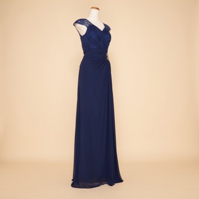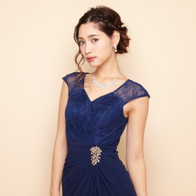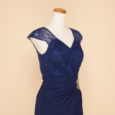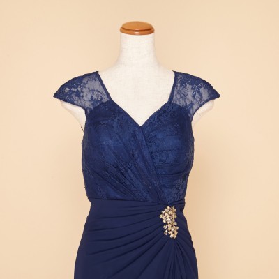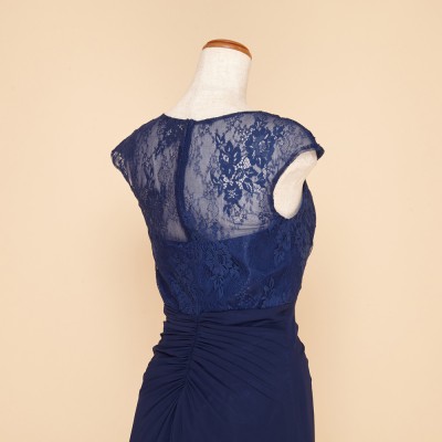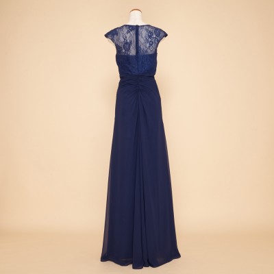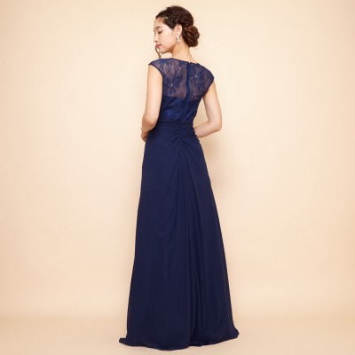 肩と背中を上品なレースでカバーしたスレンダーラインのシフォンロングドレスです。ピアノ・バイオリンなどの演奏時に腕周りが窮屈にならないように袖の開き具合にこだわりました。ヒップラインにギャザーを付けることで、ヒップアップ効果も抜群!後姿も美しくエレガントになりました。定番ネイビーはパーティドレス、演奏会ドレス、お呼ばれドレスなど様々なシーンで活用しやすいカラードレスです。