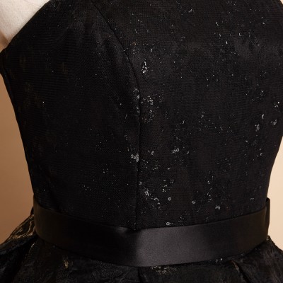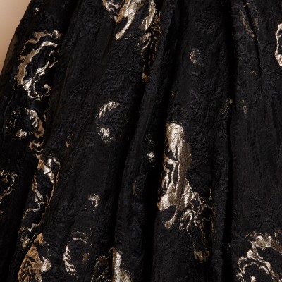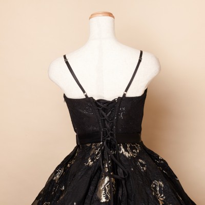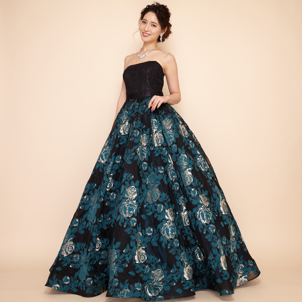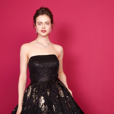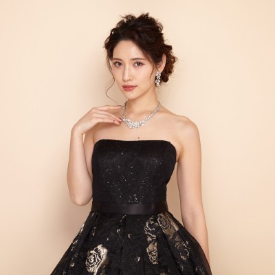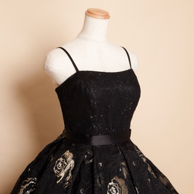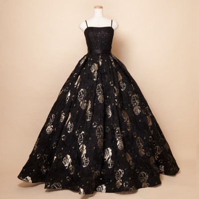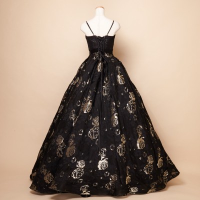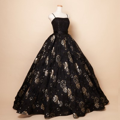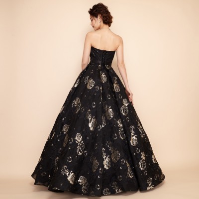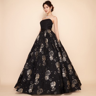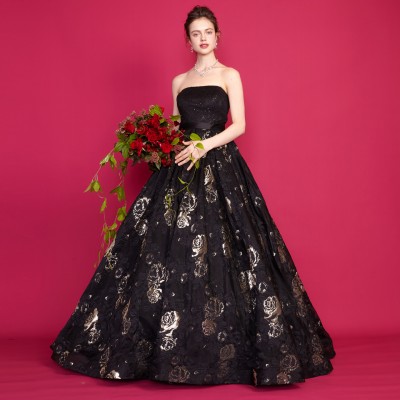 ANNABELLEオリジナルフラワージャガード生地を贅沢に使用したゴージャス&エレガントなボリュームAラインドレス。スカートに配されたゴールドのローズモチーフが大きな舞台上でも抜群の存在感を放ちます。上見頃にはさりげなく輝くブラックグリッターを散りばめているのもポイント。大人の女性にふさわしい華やかなブラックカラードレスです。