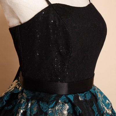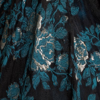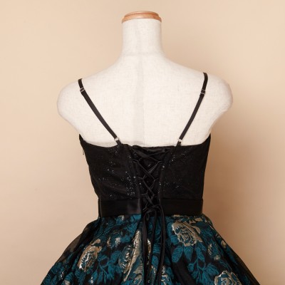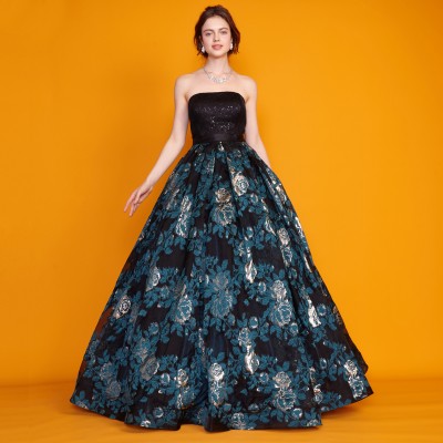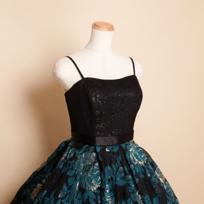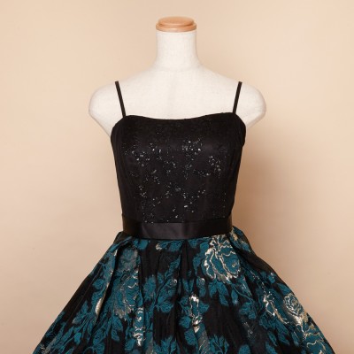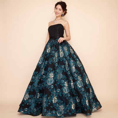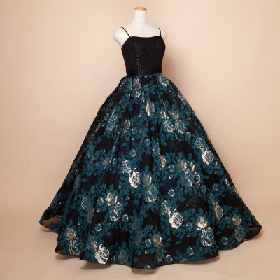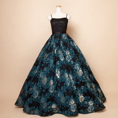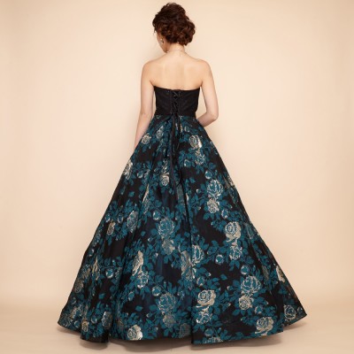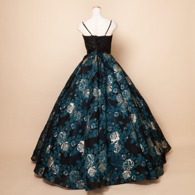 ANNABELLEオリジナルフラワージャガード生地を贅沢に使用したゴージャス&エレガントなボリュームAラインドレス。スカートに配されたゴールドのローズモチーフが大きな舞台上でも抜群の存在感を放ちます。上見頃にはさりげなく輝くブラックグリッターを散りばめているのもポイント。ダークグリーンがブラック×ゴールドに映える個性派ドレスです。