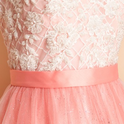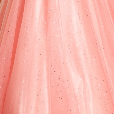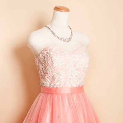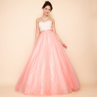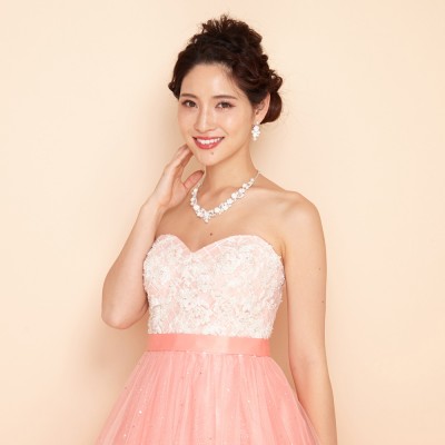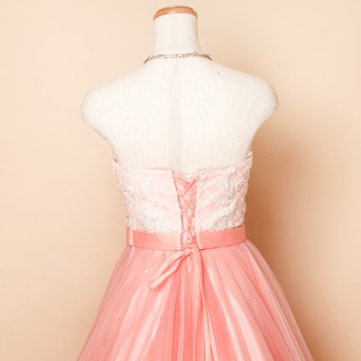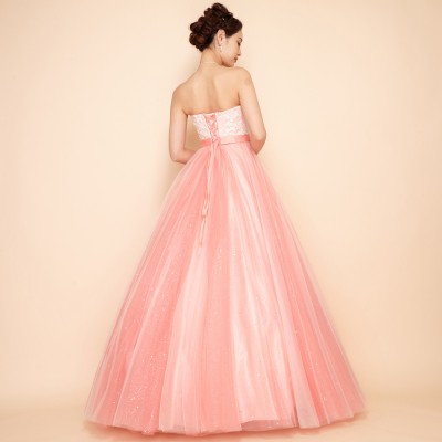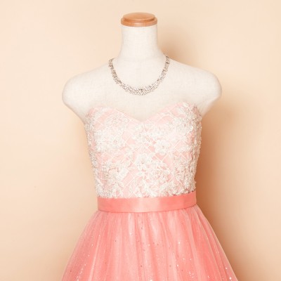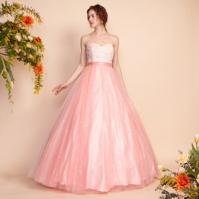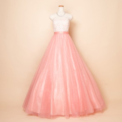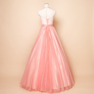 愛されピンクのキラキラロングドレス。ホワイトレースとのコントラストが可愛らしさをより引き立ててくれるステージドレスです。スカートにはコーラルピンクのグリッターが全体に散らされ、舞台上の存在感も抜群!春夏の演奏会にぴったりのとっておきドレスに♡