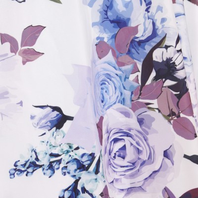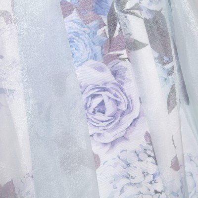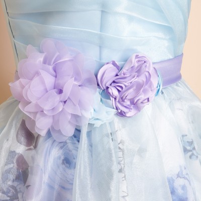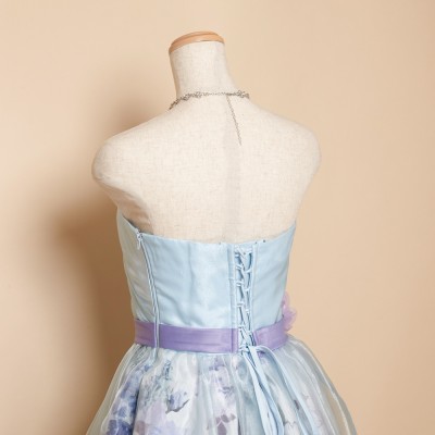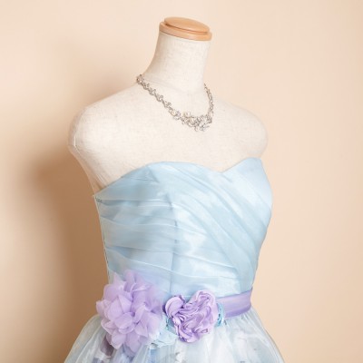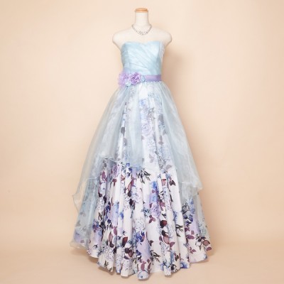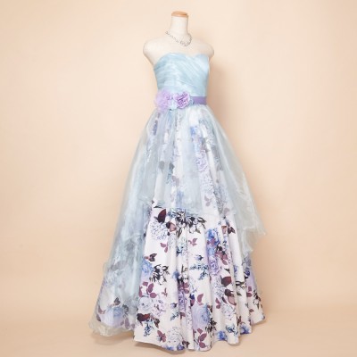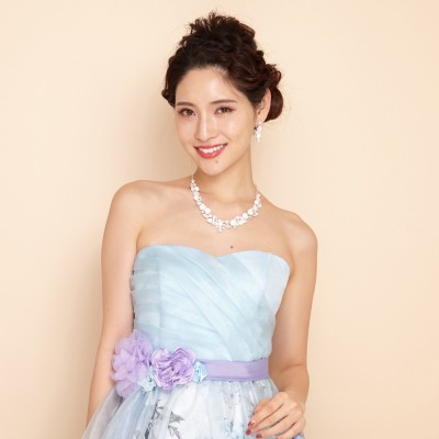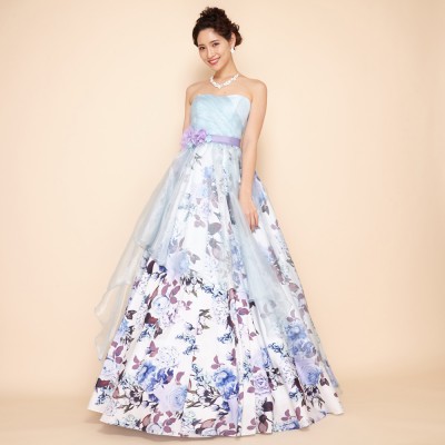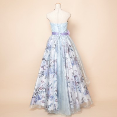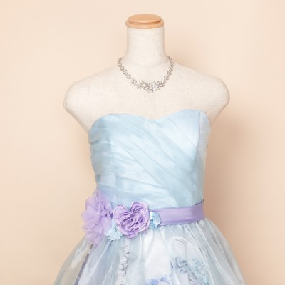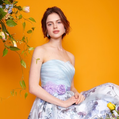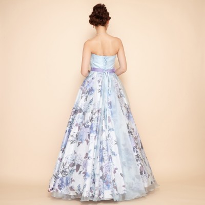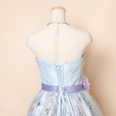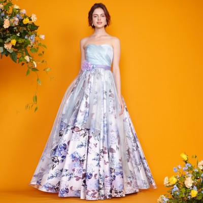 涼やかなブルーに個性的なフラワープリントが映える、春夏の演奏会にぴったりのステージドレス。ライラックのフラワーとリボンベルトが可愛らしさの中にも大人の表情を覗かせるアクセントとして配されています。レイヤースカートのデザインを存分に生かすよう、パニエで広げてふんわりと着ていただくのがアナベルのおすすめです。