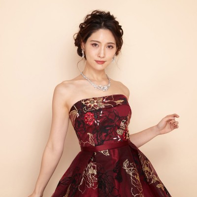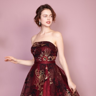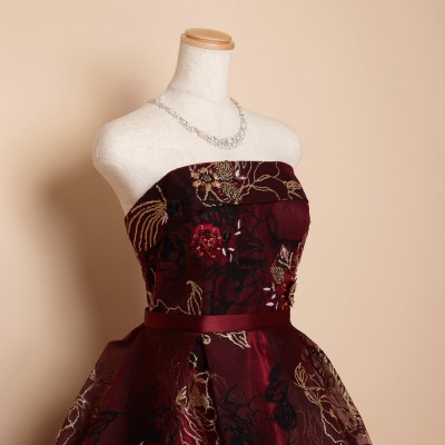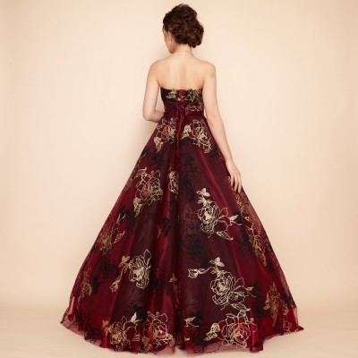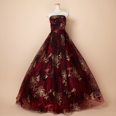 ゴールドグリッターとブラックフロッキーの薔薇模様が豪華さを際立たせるゴージャスドレス。大きく広がったスカートや深みのあるワインカラーが印象的な、大人の魅力を引き出してくれるステージドレスです。