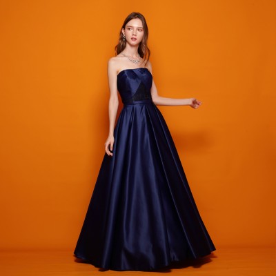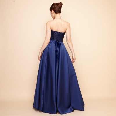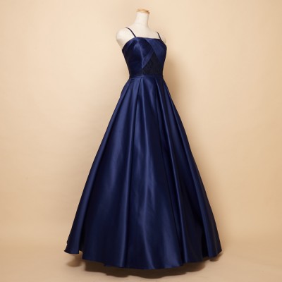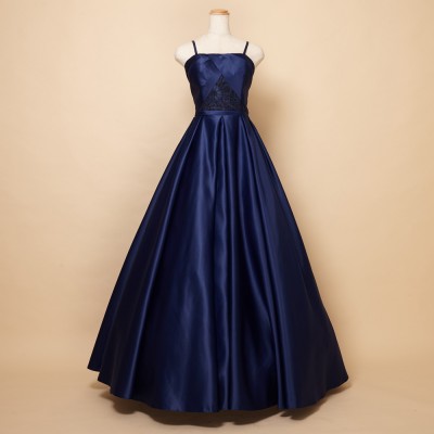 上品でシンプルなデザインに上質な厚地サテンを贅沢に使用した正統派クラシカルなドレス。演奏会ドレスとしてはもちろん、音楽コンクール用ドレスにもおすすめです。高級感あるマットな光沢と胸元と背中にあしらわれたエレガントなフラワーレースがアクセント。シックで落ち着いたネイビーカラーは伴奏ドレスにも、パニエを使って主役ドレスにもなる万能色です。