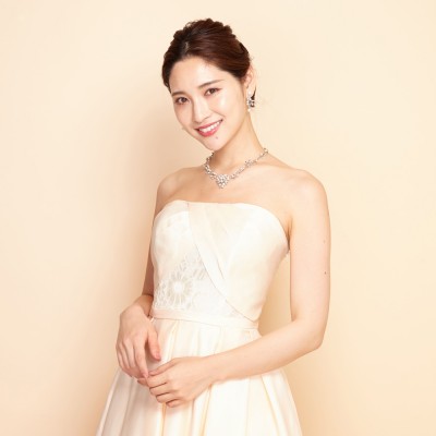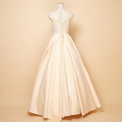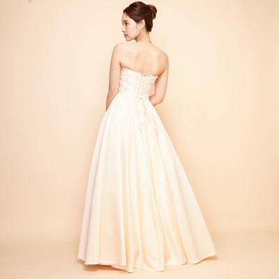 上品でシンプルなデザインに上質な厚地サテンを贅沢に使用した正統派クラシカルドレス。演奏会の衣装としてはもちろん、ウェディングドレスや2次会衣装にもおすすめです。高級感あるマットな光沢と胸元と背中にあしらわれたエレガントなフラワーレースがアクセント。柔らかなクリームカラーが繊細で清楚な印象です。