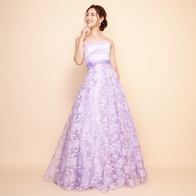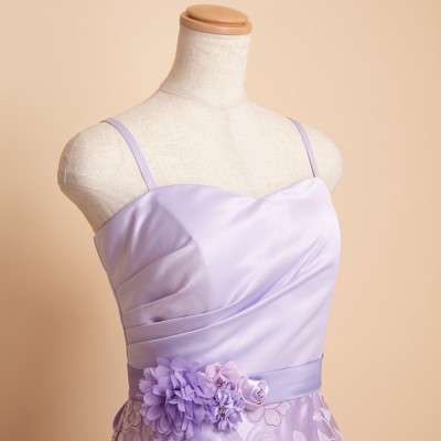 ウエストに付いた同系色のコサージュは、ドレスのイメージに合わせた特別仕様です。ふんわり柔らかい雰囲気のドレスをお探しの方におすすめしたい1着。