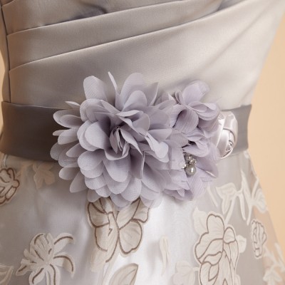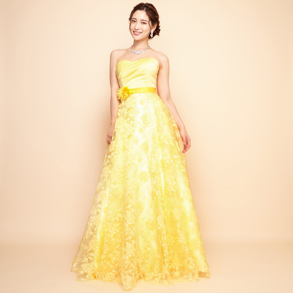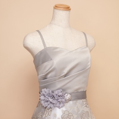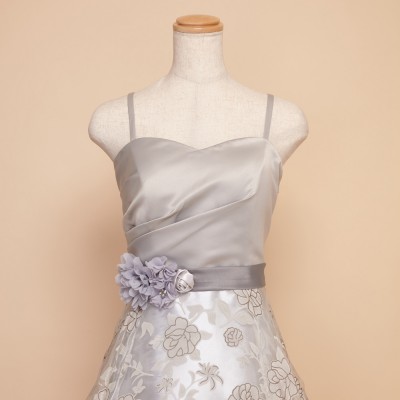 ウエストに付いた同系色のコサージュは、ドレスのイメージに合わせた特別仕様です。ふんわり柔らかい雰囲気のドレスをお探しの方におすすめしたい1着。
