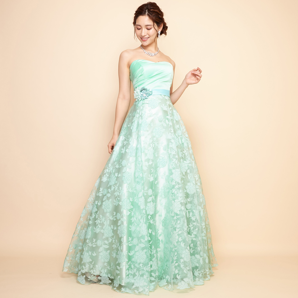 シンプルな上見頃と対照的なスカートのフラワープリントオーガンジーがとても可愛らしいステージドレス。