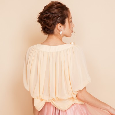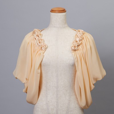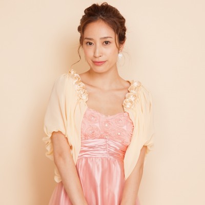 胸元に施されたローズモチーフがかわいいシフォボレロです!カバーリングとしてパーティー、結婚式、謝恩会や特別な日の食事会などにも大活躍しますよ