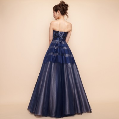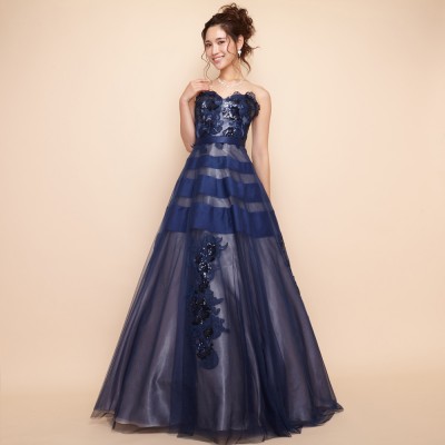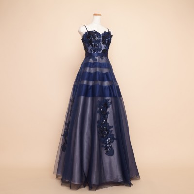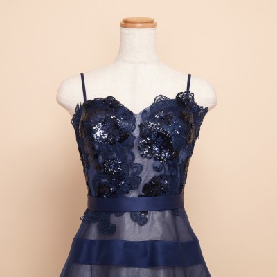 すっきりとしたAラインにお洒落なボーダーをデザインし、胸元とスカートには煌びやかなスパンコール刺繍を贅沢にあしらったステージドレス。裏地にはシャンパンベージュカラーのサテン生地を使用し、各所のデザインが浮かび上がるよう配色にもこだわりました。シックなカラー展開なので、パーティドレスとしても使いやすいドレスです。ソロ演奏など目立ちたい方にはこちらのネイビーカラーがおすすめ!華やかなアクセサリーを合わせて個性的に着こなしましょう。