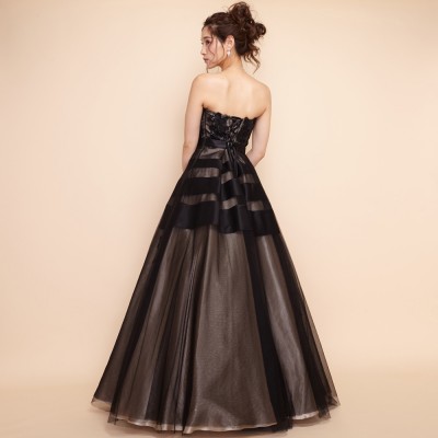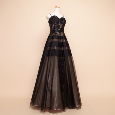 すっきりとしたAラインにお洒落なボーダーをデザインし、胸元とスカートには煌びやかなスパンコール刺繍を贅沢にあしらったステージドレス。裏地にはシャンパンベージュカラーのサテン生地を使用し、各所のデザインが浮かび上がるよう配色にもこだわりました。シックなカラー展開なので、パーティドレスとしても使いやすいドレスです。高貴な雰囲気のブラックは夜のパーティドレスとして、またオペラの衣装にもおすすめです。