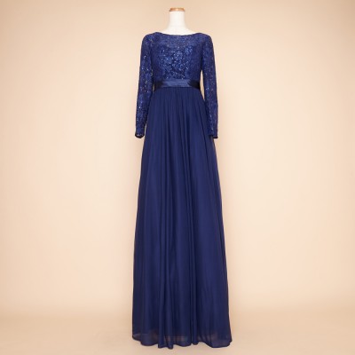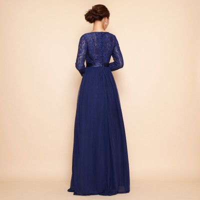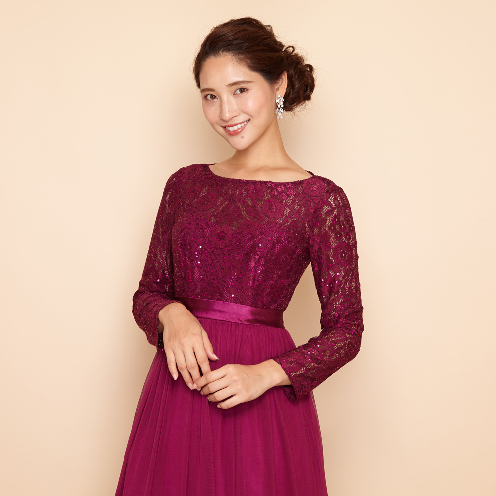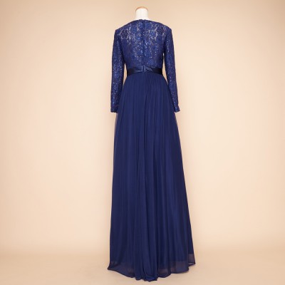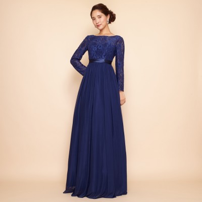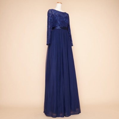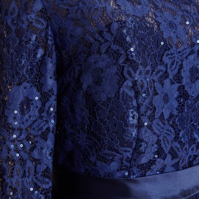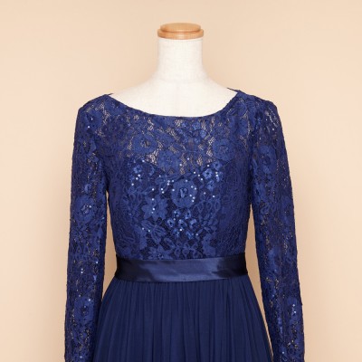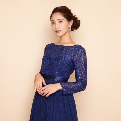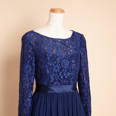 ストレッチ素材を使用したスレンダーラインのロングスリーブドレス。ちょっとした動作も窮屈にならないので、パーティドレスとしても着易いドレスです。レース生地には同色のスパンコールが散らされ、キラキラとした繊細な光がアクセントに。定番ネイビーカラーは若々しい印象でお召しいただけます。