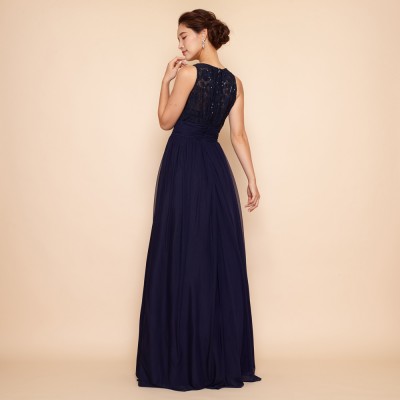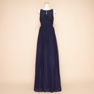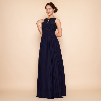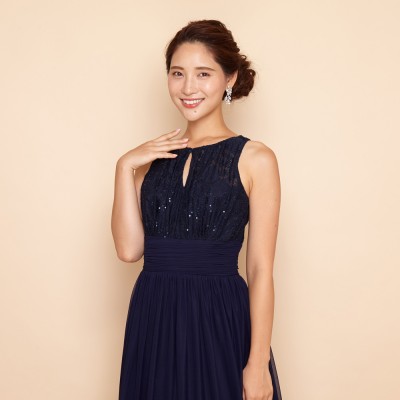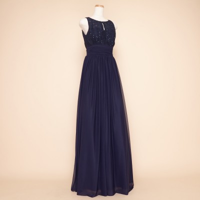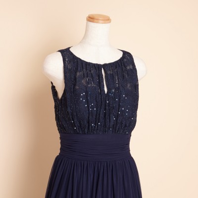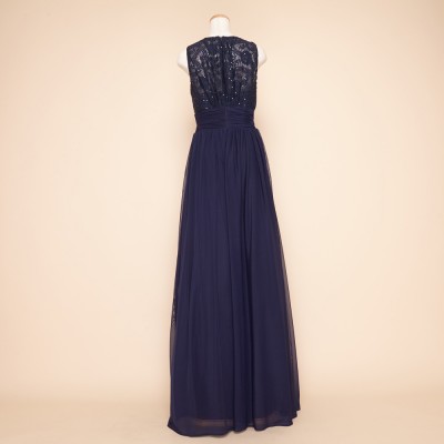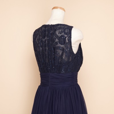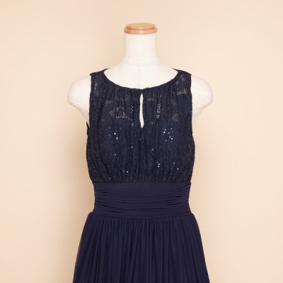 ストレッチレースを使用したスリーブレスドレス。胸元に開きをつくることで全体の印象がすっきり見えるデザインに。背中ファスナー開きで着脱も楽々。袖を付けないことで腕周りの動きに自由度を持たせ、演奏時も支障無くお使いいただけます。パーティドレスとしてもエレガントで優秀なデザインですので、様々なシーンでお使いいただけます。若々しいネイビーカラーはパーティドレスにも最適。