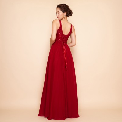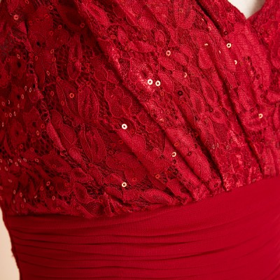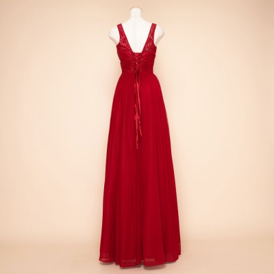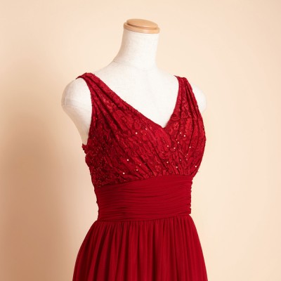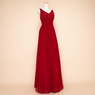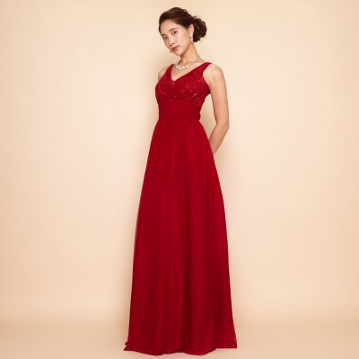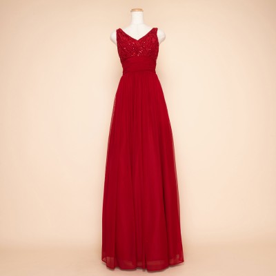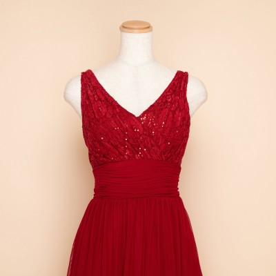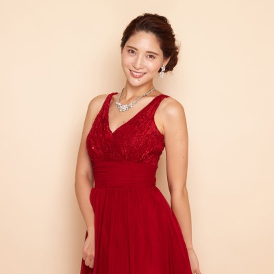 ストレッチレースを使用したⅤネックデザインのフリーサイズドレス。スパンコールが繊細に煌めく上品さとストレッチ素材のフィット感でより美しく着用できる事が魅力。情熱的なレッドカラーはパーティドレスにも、演奏会ドレスにも◎